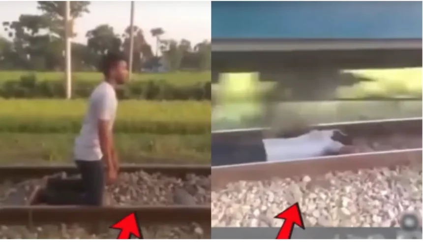 वीडियो में देखा जा सकता है कि एक युवक रेल की पटरियों पर लेट जाता है, और उसका दोस्त इस पूरे दृश्य को रिकॉर्ड कर रहा होता है। कुछ ही पलों में एक तेज रफ्तार ट्रेन सीटी बजाती हुई आती है और युवक के ऊपर से गुजर जाती है। ट्रेन के गुजरने के बाद युवक उठता है, जैसे कुछ हुआ ही न हो। वह इस खतरनाक हरकत का जश्न मनाता है, जबकि इसे देखकर लोगों की रूह कांप गई।